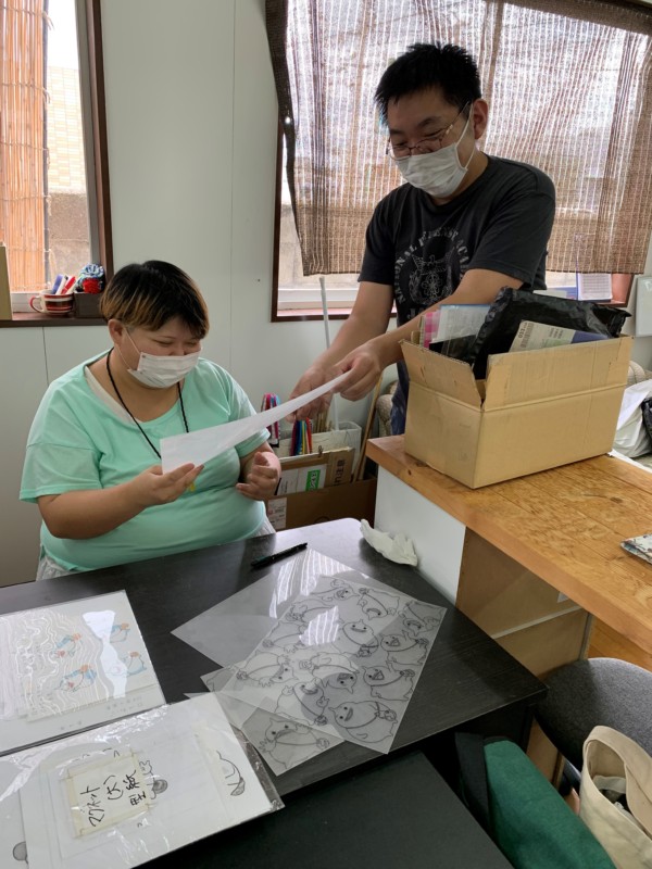 次にプラ板に下絵を描く作業です。下絵が描きやすいかを利用者さん同士でチェックをしているのですが、いい商品ができるように意見を交換しながら楽しく作業されていました。